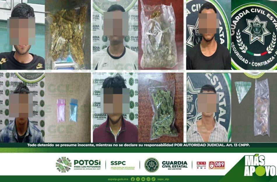 Dentro de los patrullajes preventivos, efectuados en la capital potosina, se detuvo a: César “N” de 21 años de edad, luego de asegurarle una bolsa con marihuana; Jorge “N” de 24 años, fue asegurado con una bolsa que tenía marihuana, en la colonia Jaime Torres Bodet; Juan “N” de 23 años, quedó detenido en la colonia Los Álamos, con una dosis de marihuana; sobre la colonia Arboledas del Real, Edgar “N” de 29 años y Osvaldo “N” de 40 años, fueron asegurados con cuatro dosis de “cristal”; sobre la colonia Las Trancas, Juan “N” de 25 años, quedó detenido con una dosis de “cristal”.