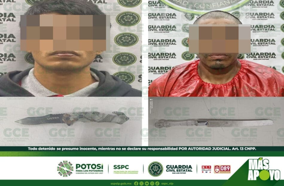 San Luis Potosí, S.L.P.- En diferentes operativos de seguridad, efectivos de la Guardia Civil Estatal (GCE) detuvieron a dos personas, por la presunta portación de armas blancas.