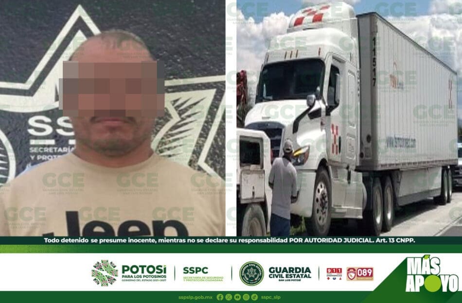 Matehuala, S.L.P.- Como resultado de los trabajos operativos para inhibir el robo a transportes de carga, efectivos de la Guardia Civil Estatal (GCE) en coordinación con el C5i2, detuvieron a un presunto ladrón a bordo de un tractocamión que había sido hurtado en la comunidad de Escalerillas, en San Luis Potosí.