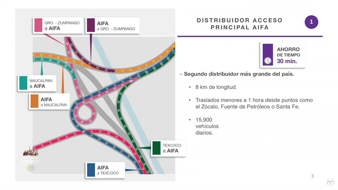En la conferencia de prensa matutina en Palacio Nacional, encabezada por el presidente Andrés Manuel López Obrador, Nuño Lara, afirmó que con estos proyectos, para llegar desde el Zócalo de la Ciudad de México al AIFA, antes de las obras se requería 144 minutos en automóvil, mientras que ahora se puede hacer el recorrido en 60 minutos, es decir, una reducción el 58 por ciento el tiempo de traslado.