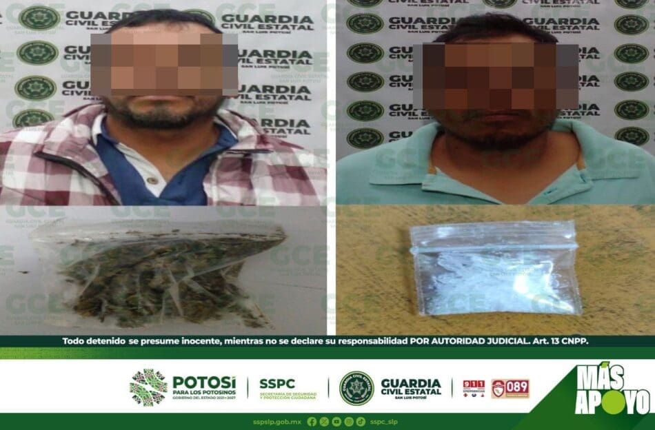 San Luis Potosí, S.L.P.- En respuesta a un reporte ciudadano, sobre un hecho de riña en donde una persona perdió la vida, agentes de la Guardia Civil Estatal (GCE) detuvieron a dos masculinos, como presuntos responsables de este hecho, a quienes además se les aseguró droga.
