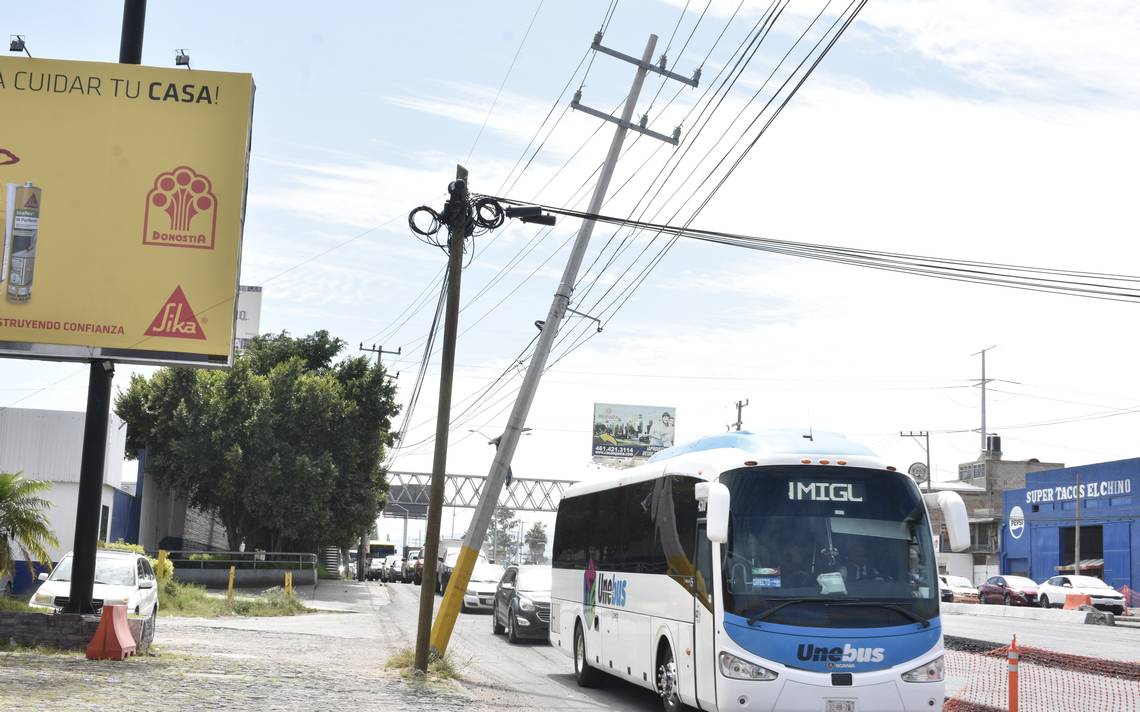CELAYA,Gto.- Inclinado al arroyo vehicular y con las varillas de la base al descubierto, es como quedó un poste de energía ubicado en la avenida Tecnológico a la Salida a San Miguel de Allende, luego de que el conductor de una tolva circulara el pasado 21 de septiembre con la caja recolectora elevada, provocando con ello que los cables se jalaran junto con el poste. De acuerdo con Fátima, comerciante de la zona, este evento ha puesto en peligro a los automovilistas que circulan por el lugar.