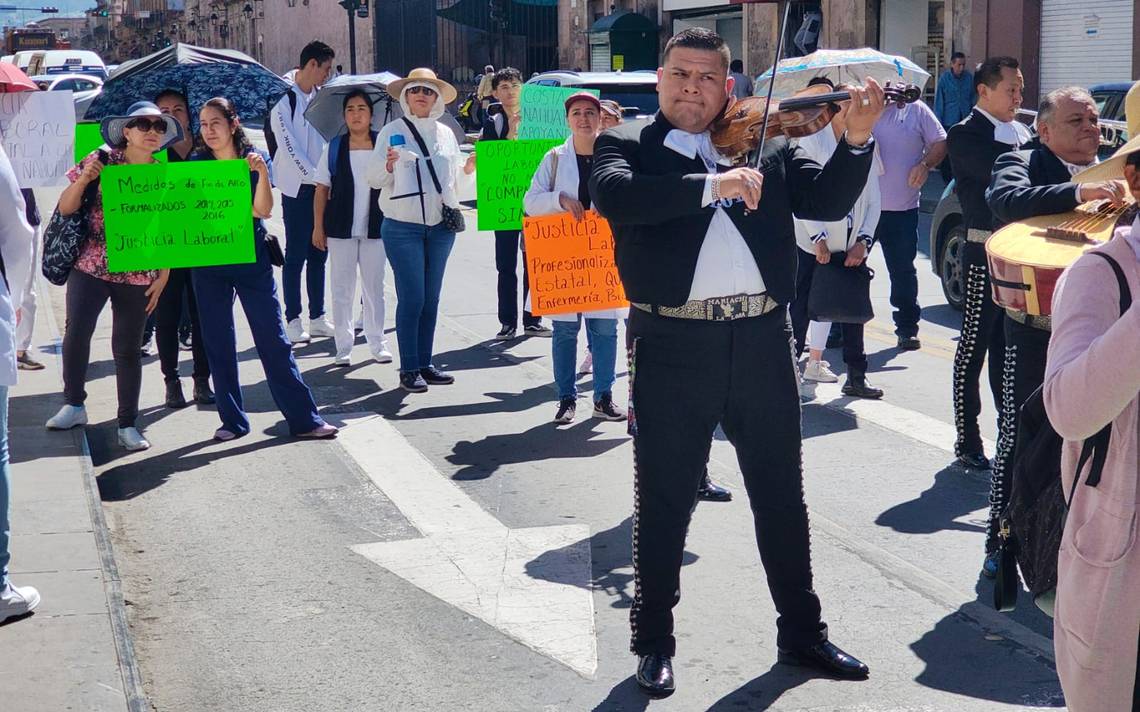 Morelia, Michoacán.- Con un mariachi frente al Congreso del Estado, un pequeño contingente de la Unión Nacional de Trabajadores del Sector Salud se manifestaron para exigir mejores condiciones de trabajo y bases para quienes laboran sin prestaciones.