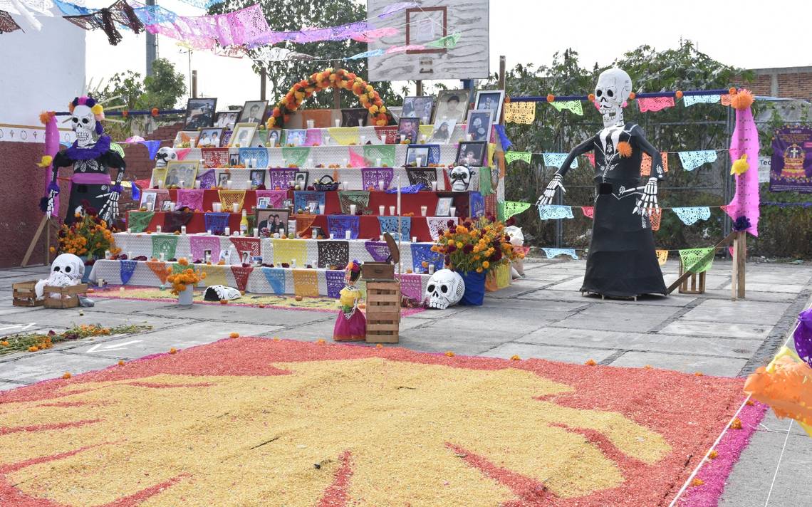CELAYA, Gto.- Una calavera gigante, un gran cementerio, dos mojigangas, así como un camino de veladoras, tapetes y flores de cempasúchil, son los elementos más representativos que el Grupo B25 del Barrio de Santiaguito colocó en el mega altar de muertos en honor a todos los vecinos que ya fallecieron.