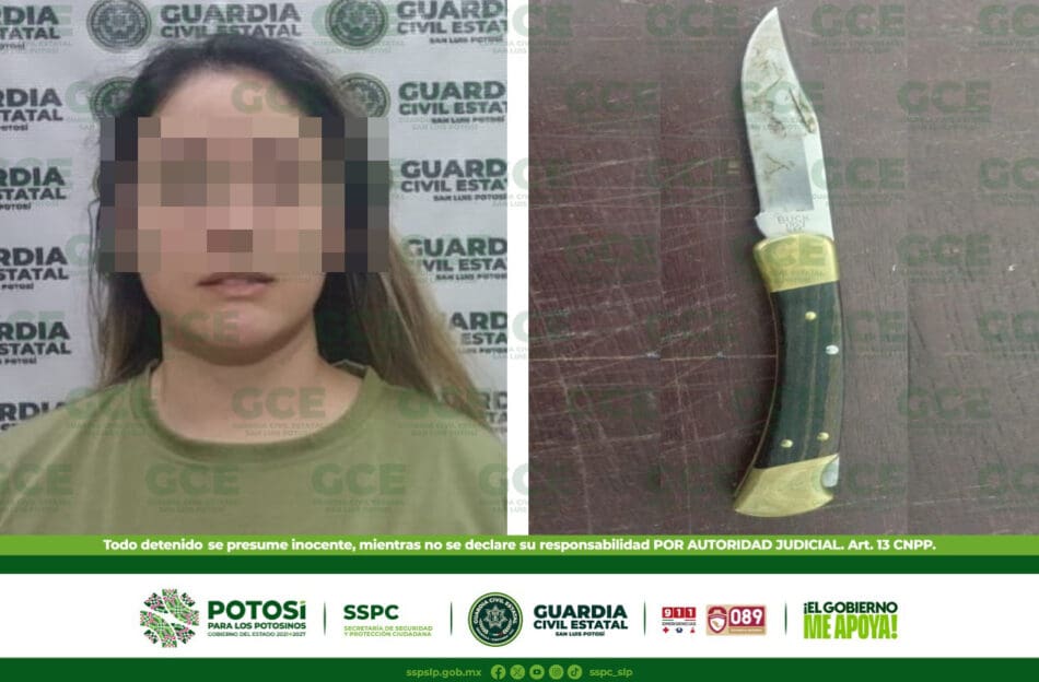 San Luis Potosí, S.L.P.- Agentes de la Guardia Civil Estatal detuvieron a una mujer señalada de haber amenazado con una navaja a otra en la colonia Lomas Cuarta Sección.