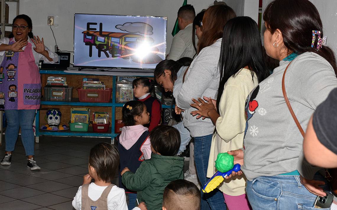 Otra actividad fue entregar una hoja en blanco a padres y madres de familia, así como al regidor y a la directora, y con la ayuda de los niños, las hojas en blanco se llenaron de sueños, colores de soles y flores, y trenes cargados de aplausos, cosquillas y explosivas carcajadas.