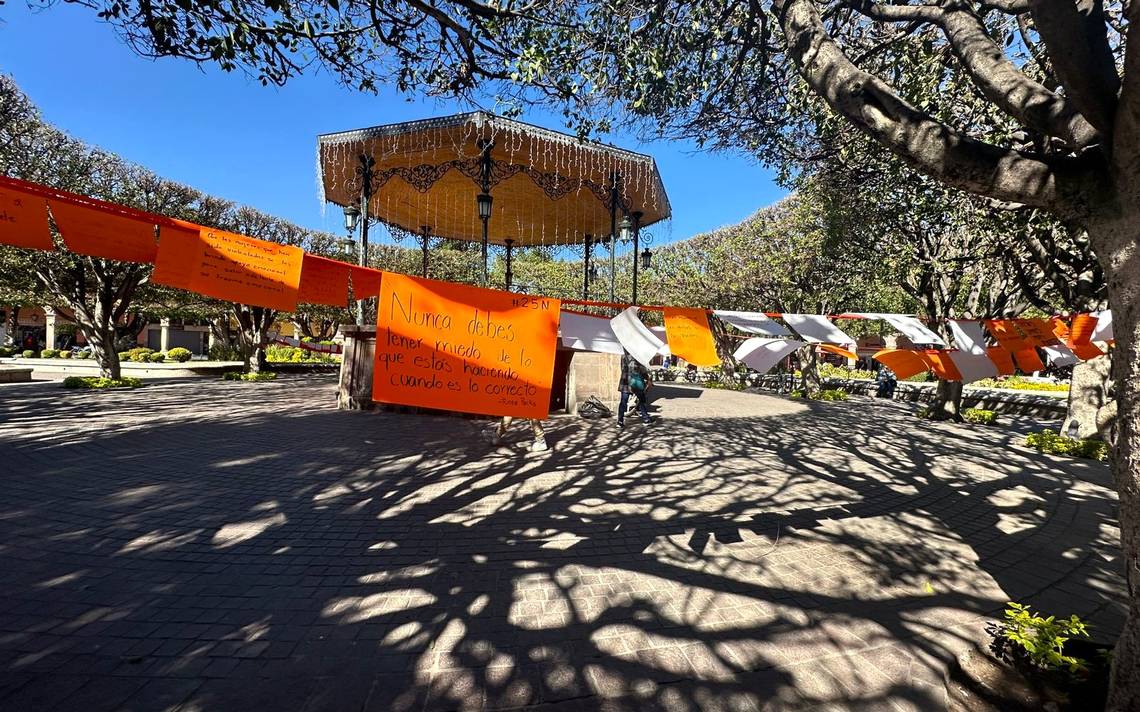 CELAYA, Gto.- En el kiosco del Jardín Principal fue colocado un “Tendedero” con cartulinas naranjas y blancas en alusión al Día Internacional para la Eliminación de la Violencia contra las Mujeres y, donde se pueden leer frases como: “Juntas somos más fuertes”, “Fuera la violencia”, “Todos debemos defender a las niñas y a las mujeres”, “Que se hagan más rápidos los procesos de denuncia” y “Promover el consentimiento”.
