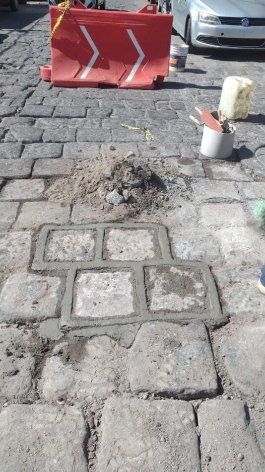 En la calle de Melchor Ocampo y Uresti se realizaron trabajos en donde se repararon adoquines, así como tambíen se revisó que no se presentaran fugas de agua potable o drenaje, y las obras se realizaron de manera rápida para evitar entorpecer el tráfico.