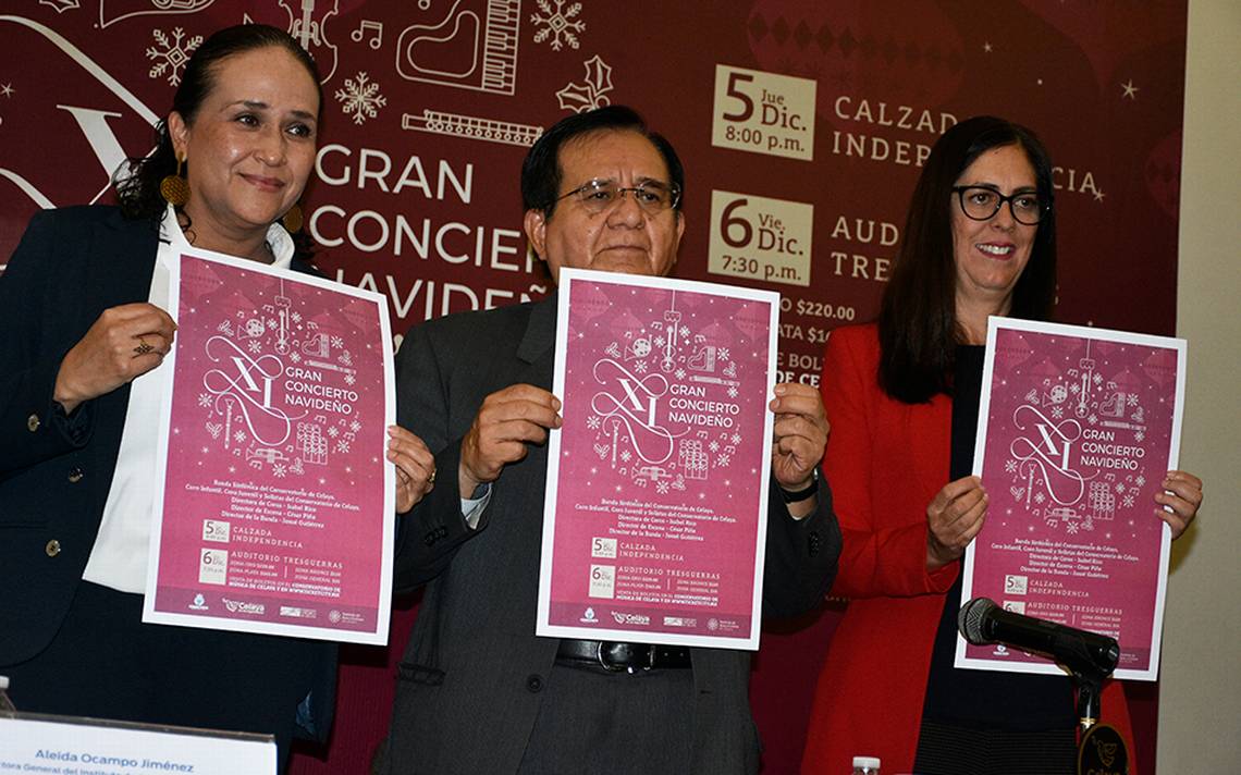 La titular del Conservatorio de Música y Artes de Celaya, Aurora Cárdenas Ávila, informó que el Concierto de Navidad se realizará el jueves 5 de diciembre a las 20:00 horas en la Calzada Independencia donde se espera la asistencia de cuatro mil personas aproximadamente.