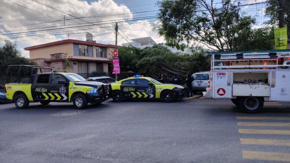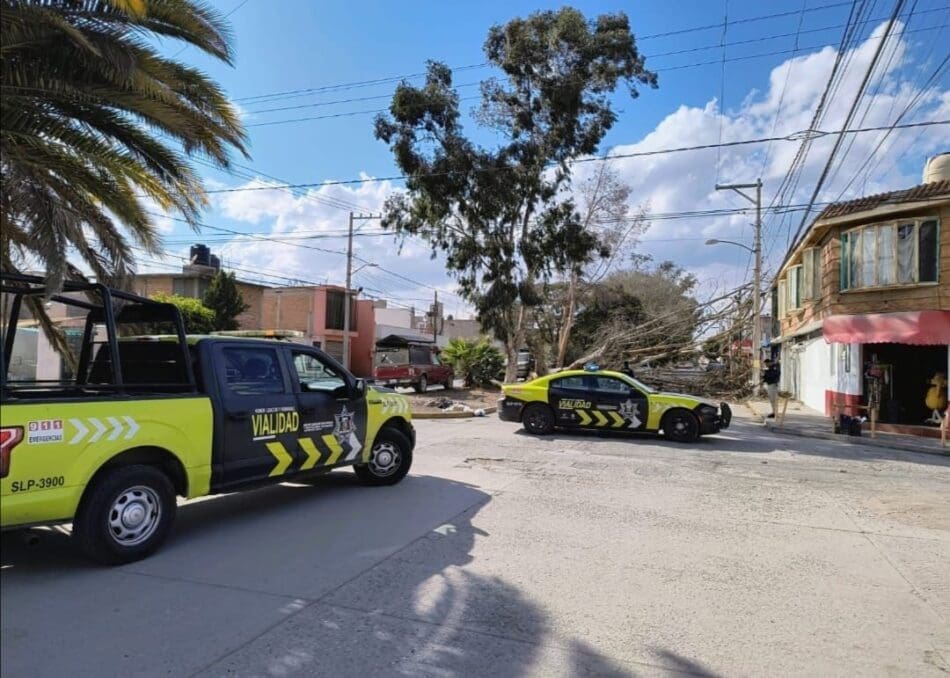 El personal municipal atiende la caída de árboles en las calles Naranjos y Cuauhtémoc, en la colonia Jardín; en avenida Ponciano Arriaga, en dirección a avenida del Sauce; así como en Urbano Villalón, en la colonia Graciano Sánchez.