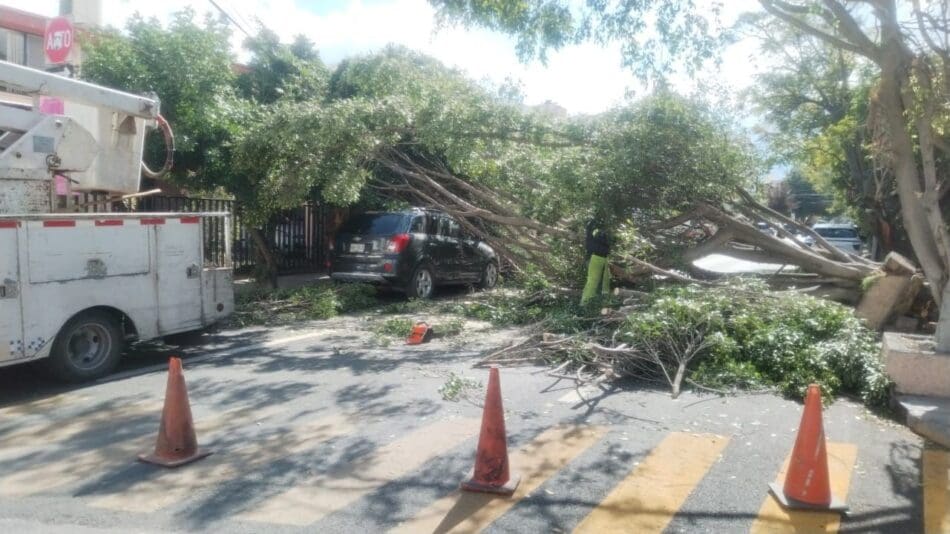 Protección Civil, Policía Vial y Servicios Municipales atienden distintos puntos de la ciudad, para resguardar el lugar y retirar de inmediato los restos del árbol.