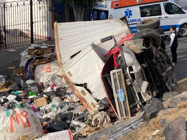 El accidente se originó luego de que la pesada unidad perdiera el control, al quedarse sin frenos, por lo que chocó contra la guarnición y posteriormente volcó, quedando atravesada sobre la vialidad y la basura que transportaba quedó esparcida.