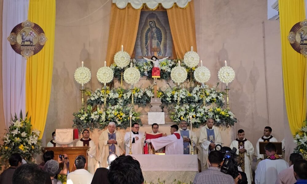 Se fueron colocando los actores al presídium en el altar mayor, el altar principal, fue adornado con ocho ceras blancas, escamadas, presidia el Señor de la Justicia, Cristo crucificado, con una falda roja y dobladillo amarillo, con expresión inocente e indefenso, y el marco con la Virgen de Guadalupe, engalanado con cortinas del S. XVlll, flores de lilis amarillas y blancas.