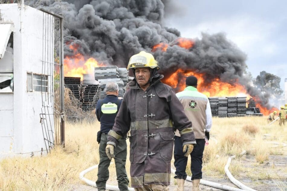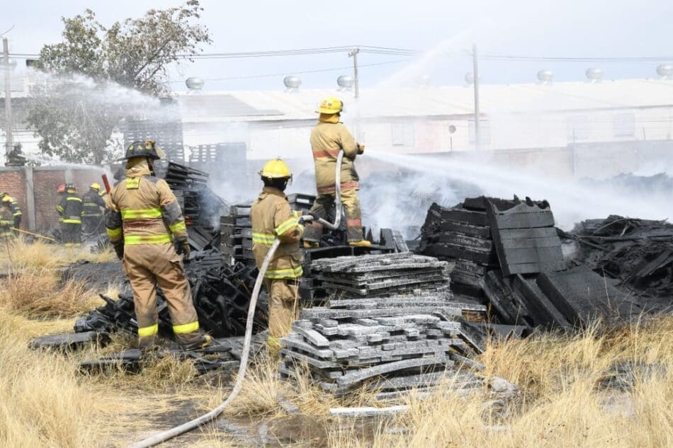 En suma de esfuerzos interinstitucionales, el Ayuntamiento de Soledad de Graciano Sánchez colabora en la extinción del incendio de grandes dimensiones, suscitado en una fábrica de tarimas, ubicada en las inmediaciones de la avenida Valentín Amador y carretera a Matehuala.
