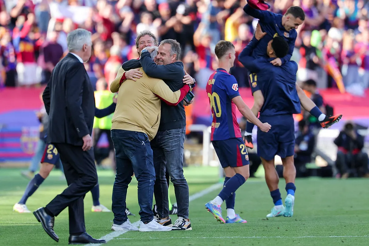 Hansi Flick es de los que prefiere tener los pies en el suelo. Por mucho que sus jugadores celebraran sobre el csped con su aficin un triunfo ante el Real Madrid que los coloca a dos puntos de hacerse con el ttulo de Liga, el entrenador del Bara prefiri rebajar la euforia. “No nos sentimos campeones todava. Estara bien conseguir tres ttulos, pero an tenemos una victoria ms que sacar”, seal el alemn en declaraciones a Movistar nada ms terminar el partido. Si el conjunto de Ancelotti no logra vencer al Mallorca en el Bernabu el prximo mircoles, o si los azulgrana se imponen al Espanyol en Cornell-El Prat el jueves, con todo, la Liga ya estar matemticamente en manos de la entidad barcelonista.