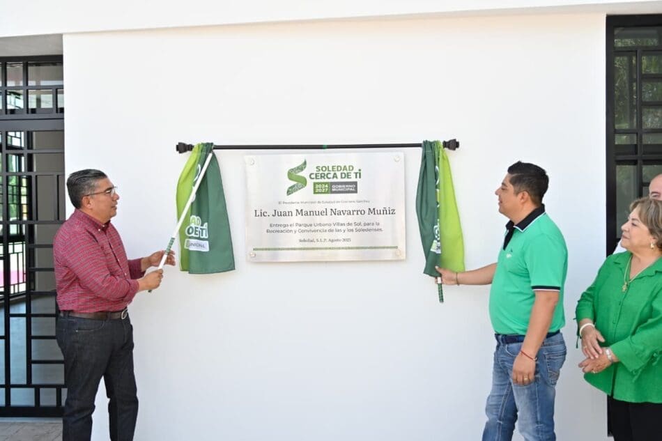 El Gobernador de San Luis Potosí Ricardo Gallardo Cardona, inauguró en la colonia Villas del Sol de Soledad de Graciano Sánchez un moderno Parque Urbano y una Purificadora gratuita dentro del mismo espacio recreativo, con lo que se transforma la calidad de vida de cerca de 20 mil habitantes de tres municipios, al ubicarse en los límites de Soledad, capital y Villa de Pozos y que además dará acceso al agua purificada sin costo, mejorando el entorno e impulsando la seguridad y la plusvalía para la zona.