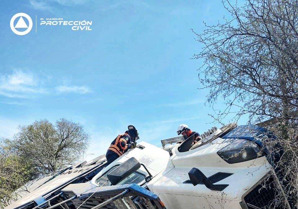 Sobre la carretera estatal 100, cuerpos de emergencias del municipio de El Marqués, se movilizaron para brindar los primeros auxilios, luego de que se reportara la volcadura de un tracto camión.