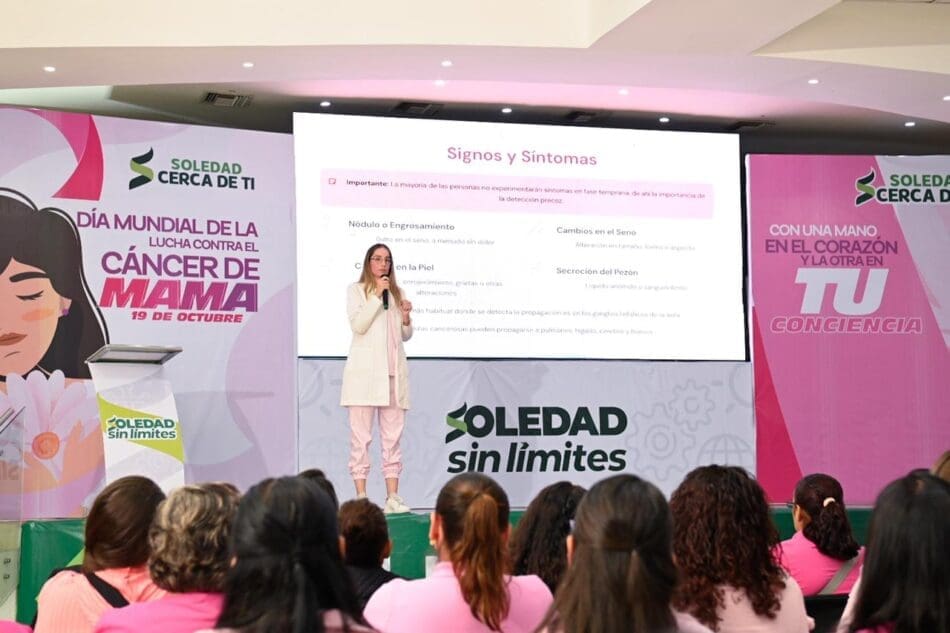 Como parte de las jornadas preventivas en el marco del Día Internacional de la lucha Contra el Cáncer de Mama, este 19 de octubre, el Ayuntamiento de de Soledad de Graciano Sánchez, encabezado por el Alcalde Juan Manuel Navarro Muñiz, brindó un espacio de reflexión y sensibilización para fortalecer la cultura del autocuidado con el Foro Rosa: “Con una mano en el corazón y otra en tu conciencia”, donde se brindó información y orientación sobre la prevención, detección temprana y atención del cáncer de mama a mujeres soledenses.