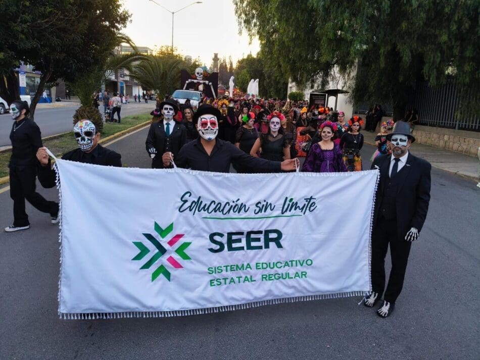 Uno de los contingentes más destacados fue el del Sistema Educativo Estatal Regular (SEER), que reunió a más de mil 300 participantes entre estudiantes, docentes y personal administrativo. Con creatividad y esmero, presentaron representaciones alusivas a la muerte y la vida, con trajes coloridos, música y mensajes que exaltaban el valor de las tradiciones. El director general del SEER, Martín Rodríguez Ramírez, reconoció el esfuerzo conjunto de las comunidades educativas y destacó el impulso del gobernador ir Ricardo Gallardo Cardona para hacer posible un evento de esta magnitud.