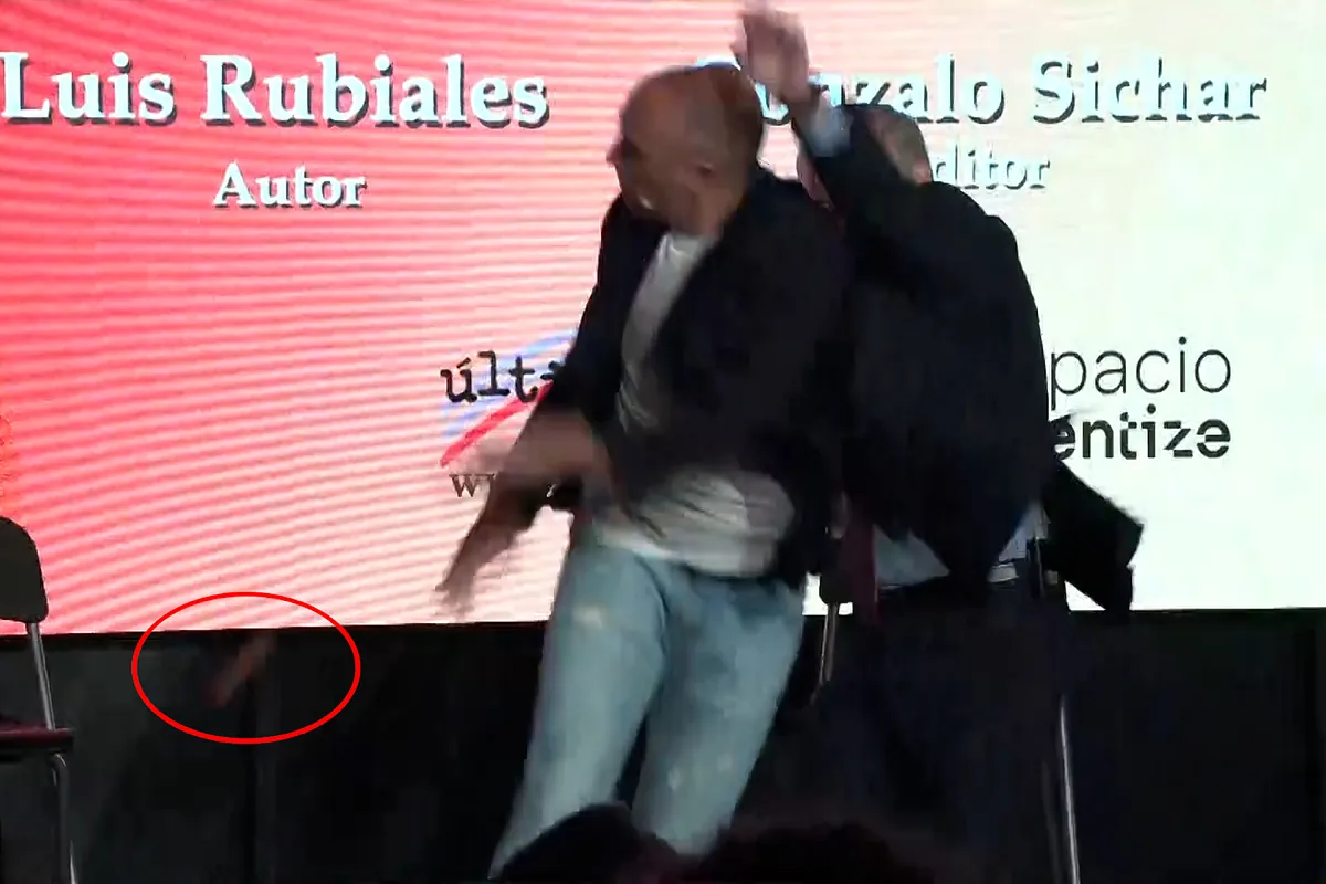 Sentado junto a Gonzalo Sichar, director de la editorial ltima Lnea, Luis Rubiales contestaba a las preguntas durante la presentacin de su libro cuando observ como un huevo impactaba en el escenario. De inmediato, se levant de su taburete y se gir para evitar otro lanzamiento. No pudo evitarlo. El huevo estall en su espalda. Hubo un tercer lanzamiento, mientras quien estaba a su lado intentaba protegerle, y entonces el ex presidente de la Federacin Espaola de Ftbol se lanz a por el agresor, un hombre con capucha y cascos. Fue su primer impulso, pero los responsables de seguridad del saln de actos, en el centro de Madrid, ya haban conseguido reducir al agresor. Lo que entonces no poda sospechar es que el agresor era de su propia familia, su to Luis Rubn Rubiales, hermano de su padre y de Juan, el to que le denunci ante la Fiscala.