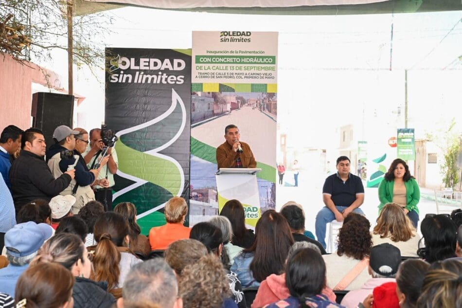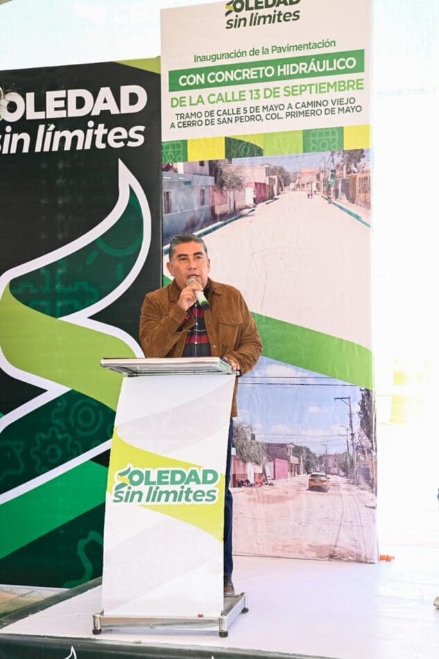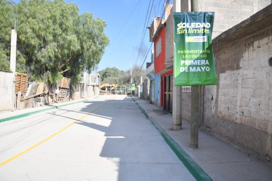 Juan Manuel Navarro Muñiz, Alcalde de Soledad de Graciano Sánchez, entregó este lunes la pavimentación con concreto hidráulico de la calle 13 de Septiembre en la colonia Primero de Mayo, obra realizada con una inversión superior a los cuatro millones de pesos, proveniente del Fondo de Fortalecimiento Municipal, que fortalece la movilidad y brinda mayor seguridad a miles de habitantes, reafirmando el compromiso del Gobierno Municipal de mantenerse cerca de las familias y atender las necesidades que expresan diariamente.