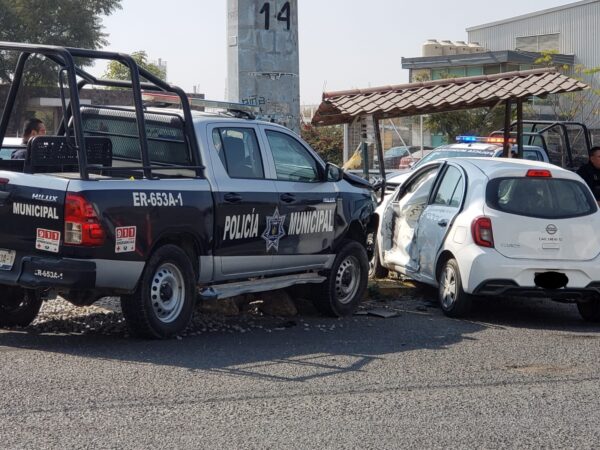 Un auto con logos oficiales y una patrulla municipal de San Juan del Río colisionaron, luego se proyectaron contra la base de un poste y una parada de camiones