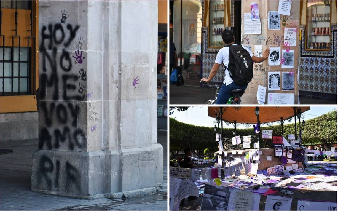 Los arcos del Portal Independencia tienen escritos de grafiti que dicen: “Hoy me voy a morir”, “la policía no me cuida, me cuidan mis amigas”; en otros arcos, con plumón o marcador, las feministas que marcharon el pasado 8 escribieron varios nombres de hombres a quienes describen como acosadores o agresores de mujeres.