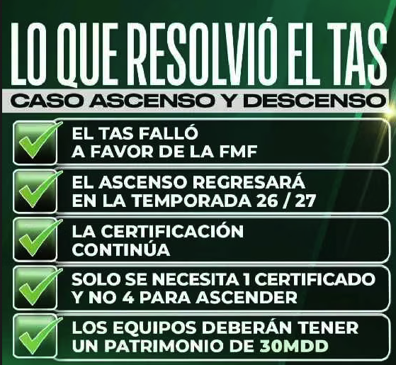 Uno de los puntos centrales de la resolución es la continuidad del proceso de certificación para los clubes que aspiren a subir a Primera División. El TAS respaldó el modelo impulsado por la FMF, el cual busca garantizar estabilidad financiera, infraestructura adecuada y viabilidad administrativa antes de permitir el ascenso.