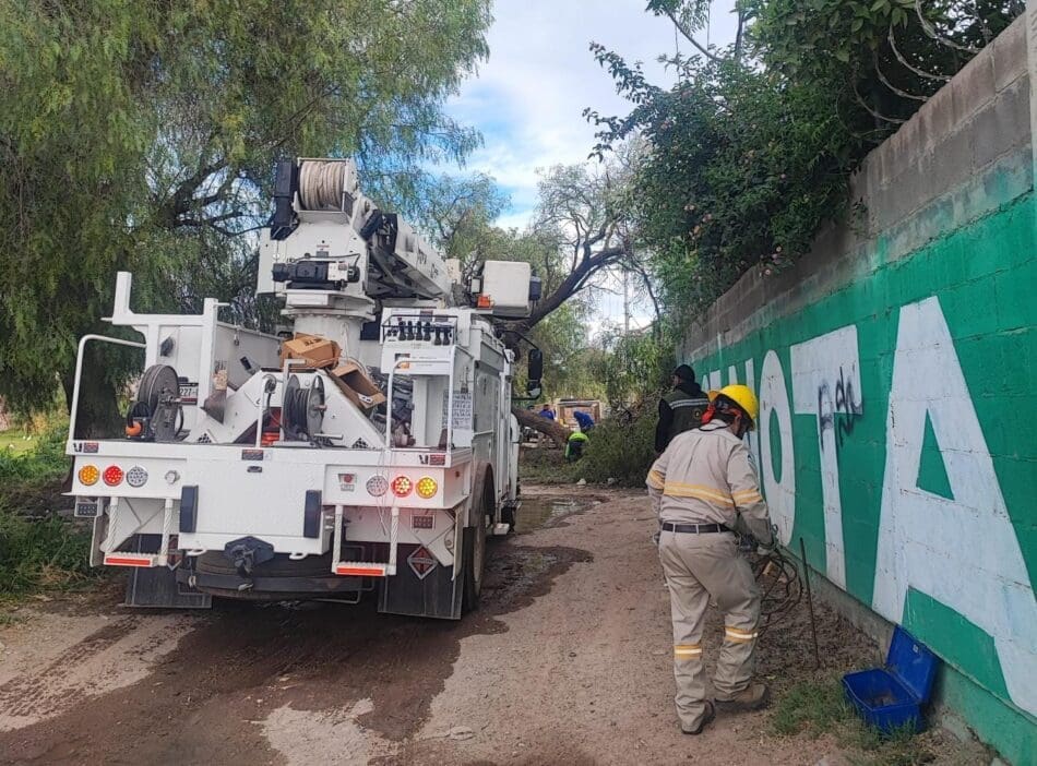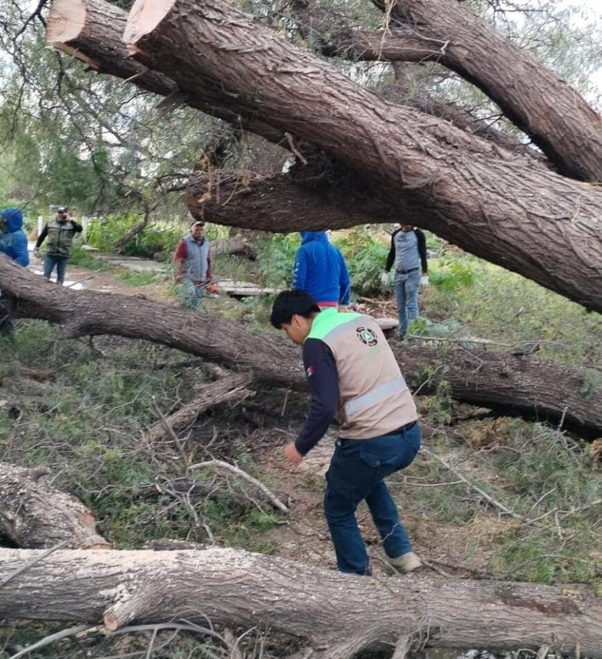 Respecto a los vientos, se atendió la caída de un árbol de gran tamaño en calle Melchor Ocampo rumbo a Fracción Rivera, que afectó cables de alta tensión; el retiro se realizó en coordinación con el área municipal de Parques y Jardines y CFE, restableciendo la energía y liberando la vía.