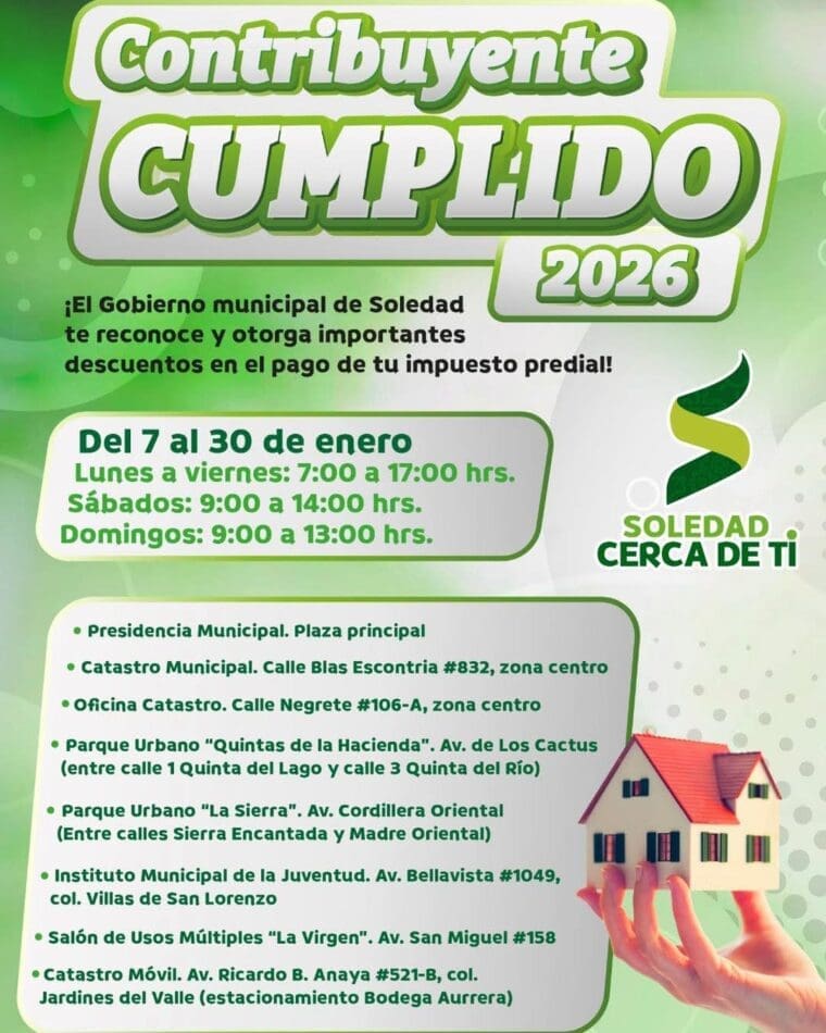 El incentivo más alto del año para el pago del impuesto predial se encuentra en su etapa final, y el Ayuntamiento de Soledad de Graciano Sánchez exhorta a la población a aprovechar el descuento del 15 por ciento vigente hasta el sábado 31 de enero, como parte del Programa Contribuyente Cumplido 2026 que coordina la Dirección de Catastro Municipal, beneficio que impacta de manera directa en la economía de las familias soledenses, siguiendo la línea de trabajo del Alcalde Juan Manuel Navarro Muñiz.