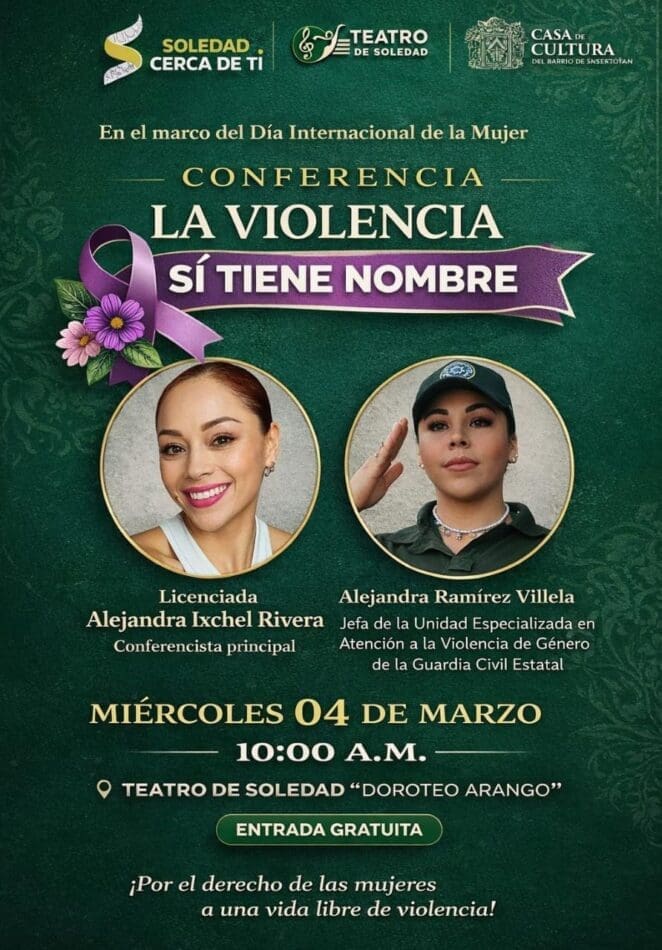 Como parte medular de esta conmemoración, este miércoles 4 de marzo a las 10:00 horas se llevará a cabo en el Teatro y Centro Cultural de Soledad la conferencia “La Violencia Sí Tiene Nombre”, organizada por la Dirección de Cultura Municipal, con entrada gratuita. La ponencia será impartida por la conferencista Alejandra Ixchel Rivera y por la jefa de la Unidad Especializada en Atención a la Violencia de Género de la Guardia Civil Estatal, Alejandra Ramírez Villa, quienes abordarán la importancia de visibilizar, identificar y denunciar las distintas manifestaciones de violencia que enfrentan las mujeres.