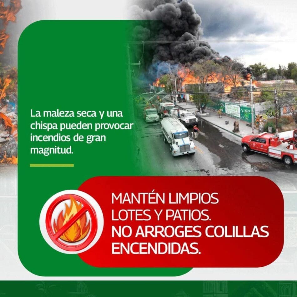 El Presidente Municipal advirtió que los incendios en lotes baldíos y espacios públicos suelen originarse por descuidos como arrojar colillas de cigarro, encender fogatas o prender fuego a residuos sólidos, situaciones que pueden salirse de control en minutos, generar temor entre la población y afectar el patrimonio de las y los soledenses.