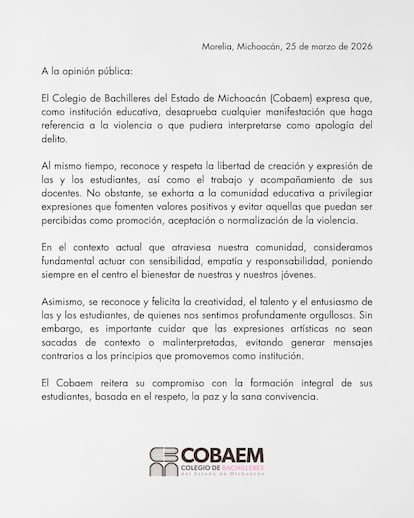 El Gobierno michoacano hace un llamado a la comunidad: “Quedan estrictamente prohibidas las manifestaciones que hagan apología al delito en cualquier expresión académica, cívia, cultural y deportiva que se realice en el Cobaem”. También advierte: “Al que provoque públicamente a comer un delito, incite al consumo de sustancias ilícitas o haga apologías de éstos, se le impondrán de tres a seis meses de prisión y multa de 80 a 150 Unidades de Medidad de Actualización [que este año se situa en 117,31 pesos]”.