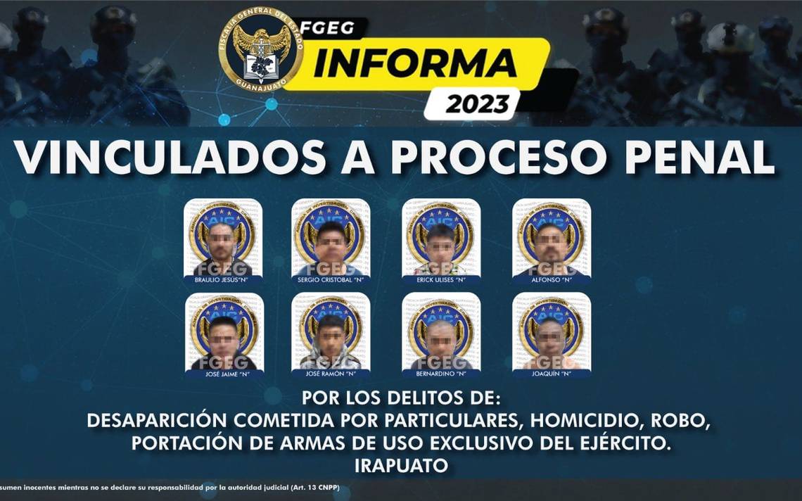 Serán varios los elementos de prueba e investigativos los que serán presentados durante este proceso penal por homicidio calificado, además, como fue expuesto por el Fiscal General, los detenidos quedaron vinculados a proceso no sólo por el homicidio, sino por robo, desaparición cometida por particulares, y portación de armas de uso exclusivo del ejército esto fue determinado por un juez este viernes. Mientras tanto, Braulio N., Alfonso N., José Ramón N., José Jaime N., Bernardino N., Joaquín N., Erick Ulises N. y Sergio N. permanecerán bajo la medida de prisión preventiva, durante todo el tiempo que dure el proceso penal al que se enfrentan.