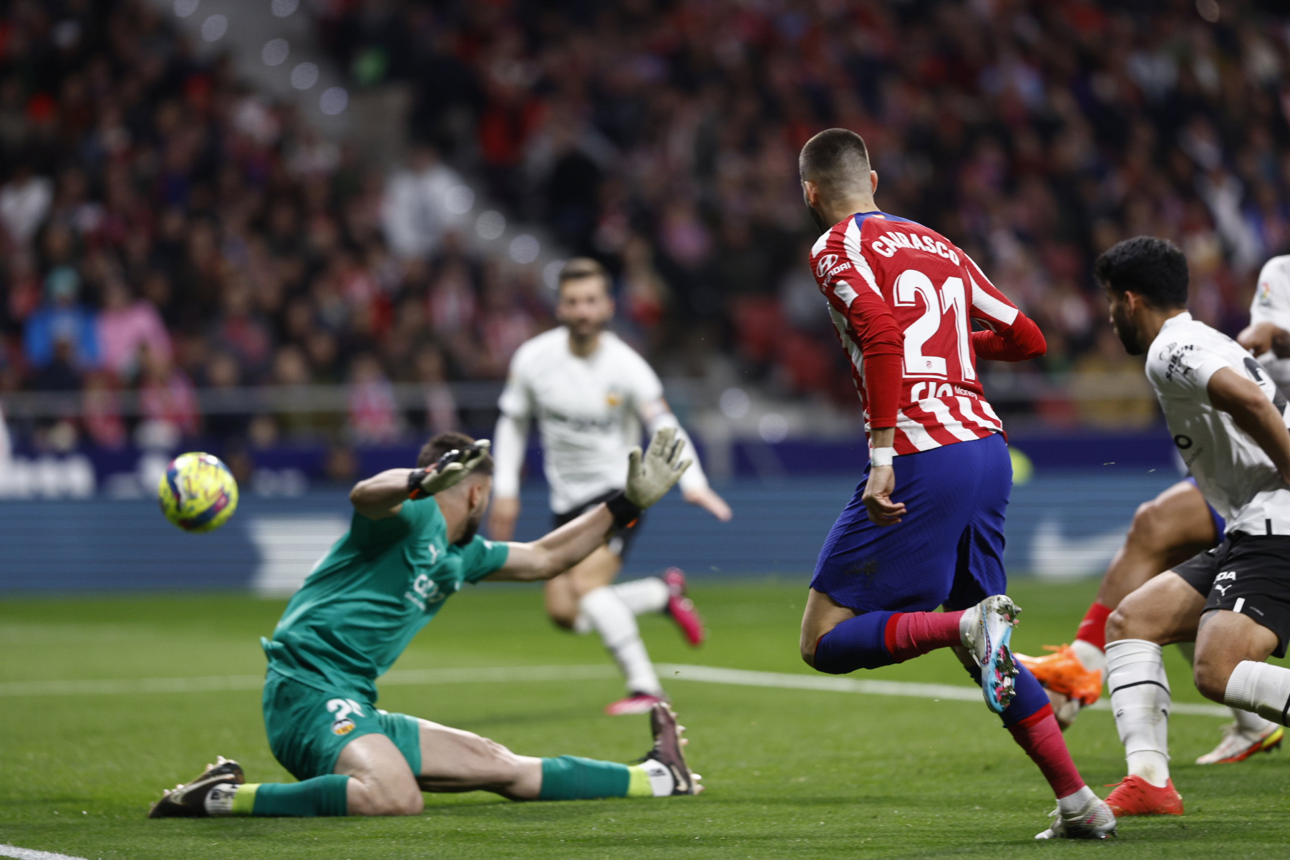 A la tercera, Griezmann no perdon. Esta vez fue mrito propio y demrito ajeno, con el centro del campo visitante dejando campar a sus anchas a Marcos Llorente, que asisti al galo para el primer gol de la noche. El empate de Hugo Duro fue anulado por el VAR por un pisotn a Depay que el rbitro no apreci en primera instancia. Pese a ese destello, el Valencia acab pidiendo el descanso como un boxeador exhausto implora por un respiro entre rounds.