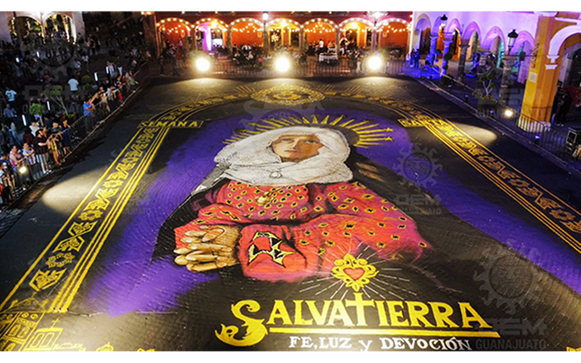 SALVATIERRA, Gto.- (OEM-Informex).- Integrantes de la Asociación Tapetera de Uriangato AC realizaron un monumental tapete con la imagen de la Virgen Dolorosa en la Explanada del Carmen, siendo la obra más grande que realizan fuera de su municipio con medidas de 20 x 40 metros.