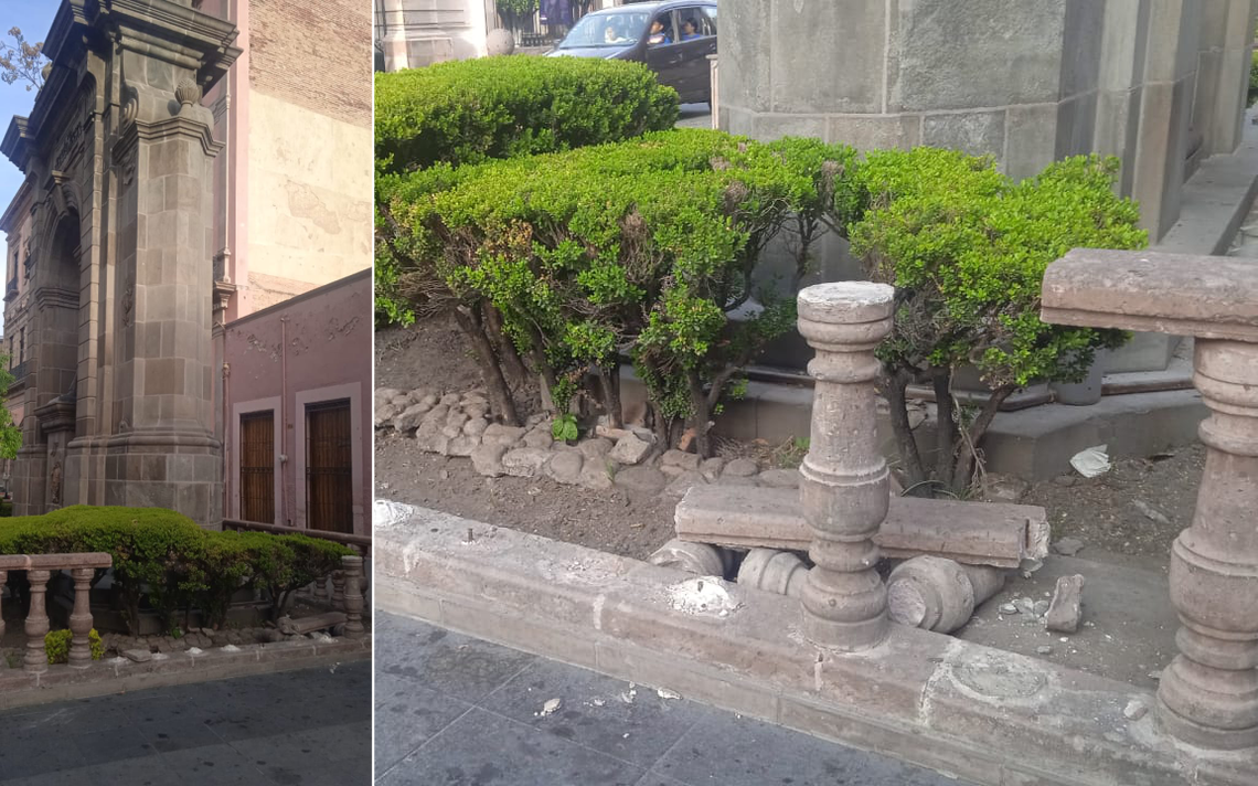 Claramente se nota la destrucción que le hicieron al monumento en donde faltan más de ocho balaustres de cantera, es decir, más de la mitad de esta cerca, la cual se pueden observar unos pedazos al interior en la jardinera mientras que la mayoría del barandal ya fue retirada.