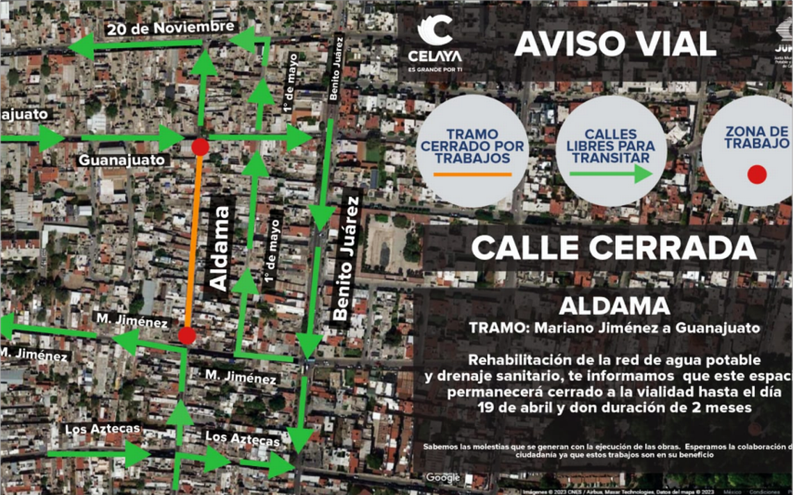 CERLAYA, Gto.- (OEM-Informex)..- La Junta Municipal de Agua Potable y Alcantarillado de Celaya (JUMAPA) iniciará este próximo miércoles 19 de abril, la obra de rehabilitación de la red de agua potable y drenaje sanitario en la calle de Hermanos Aldama, en el tramo de la calle Mariano Jiménez a la calle Guanajuato.