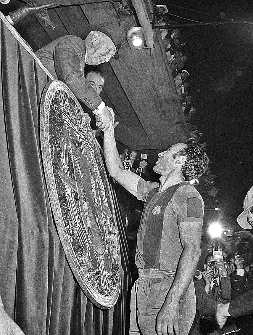 Precisamente una final de Copa del Generalsimo, la de 1951, sirvi al Bara para condecorar a Franco con la insignia de oro y brillantes en el mismo palco del Bernabu. Le dio la suya el presidente Agustn Montal Galobart porque en la celebracin de las bodas de oro, el Bara mostr una ligera tendencia de corte catalanista, aunque fue simplemente folklrica, y eso se tena que hacer perdonar, lo justifica Frederic Porta.