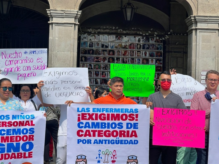 Cuernavaca, Mor. Enfermeras y médicos del hospital del Niño Morelense protestaron este lunes frente a palacio estatal para exigir al gobernador Cuauhtémoc Blanco Bravo, la contratación de más personal, para atender a los menores de edad pues carecen de trabajadores de la salud.