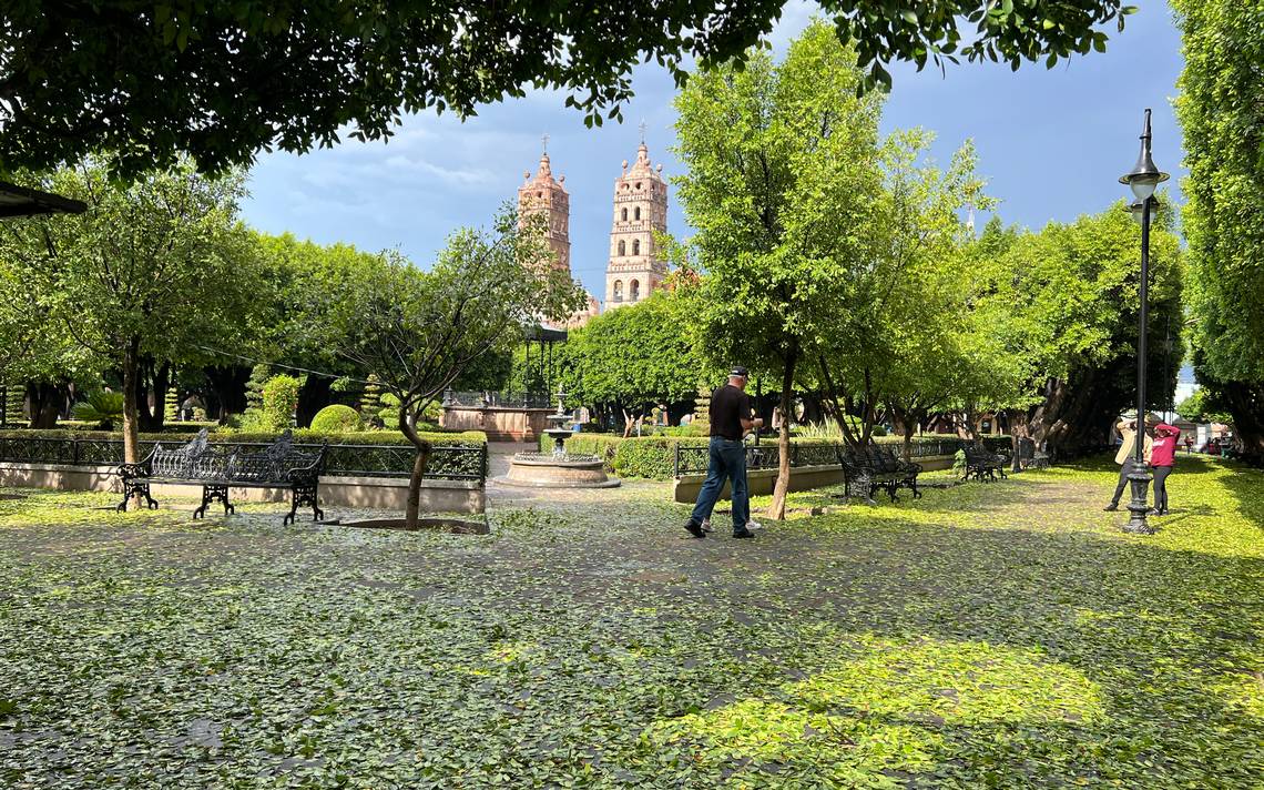 SALVATIERRA, Gto.- Se registró el primer aguacero en Salvatierra, destacando la caída de granizo, el cual deshojó los árboles del jardín de Salvatierra, donde miles de hojas dieron un gran espectáculo a salvaterrenses y turistas, quienes no perdieron el tiempo y se tomaron fotografías del recuerdo, por su parte Protección Civil no reportó daños ni afectaciones por la fuerte lluvia que azotó el municipio.